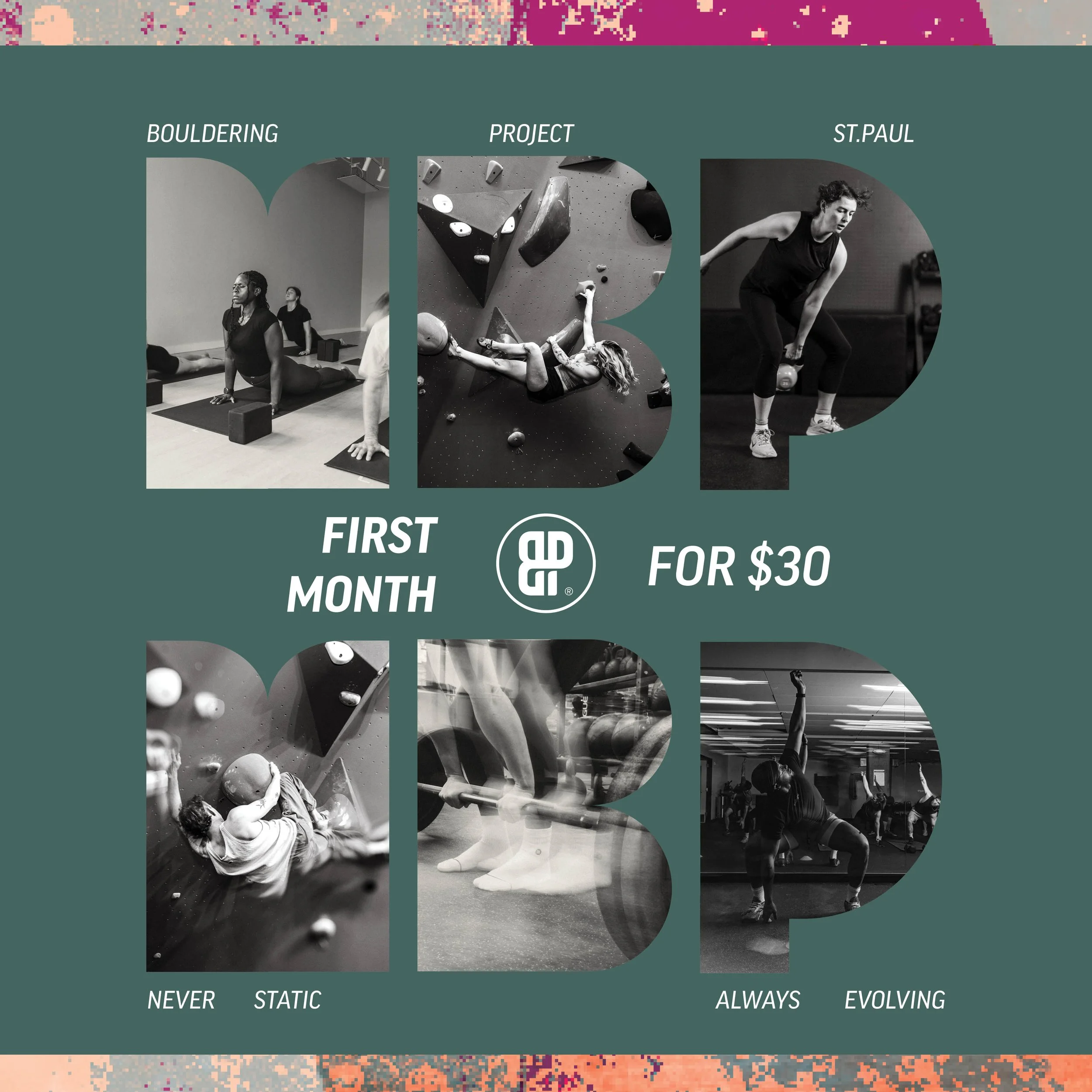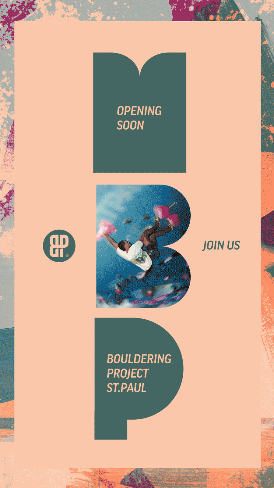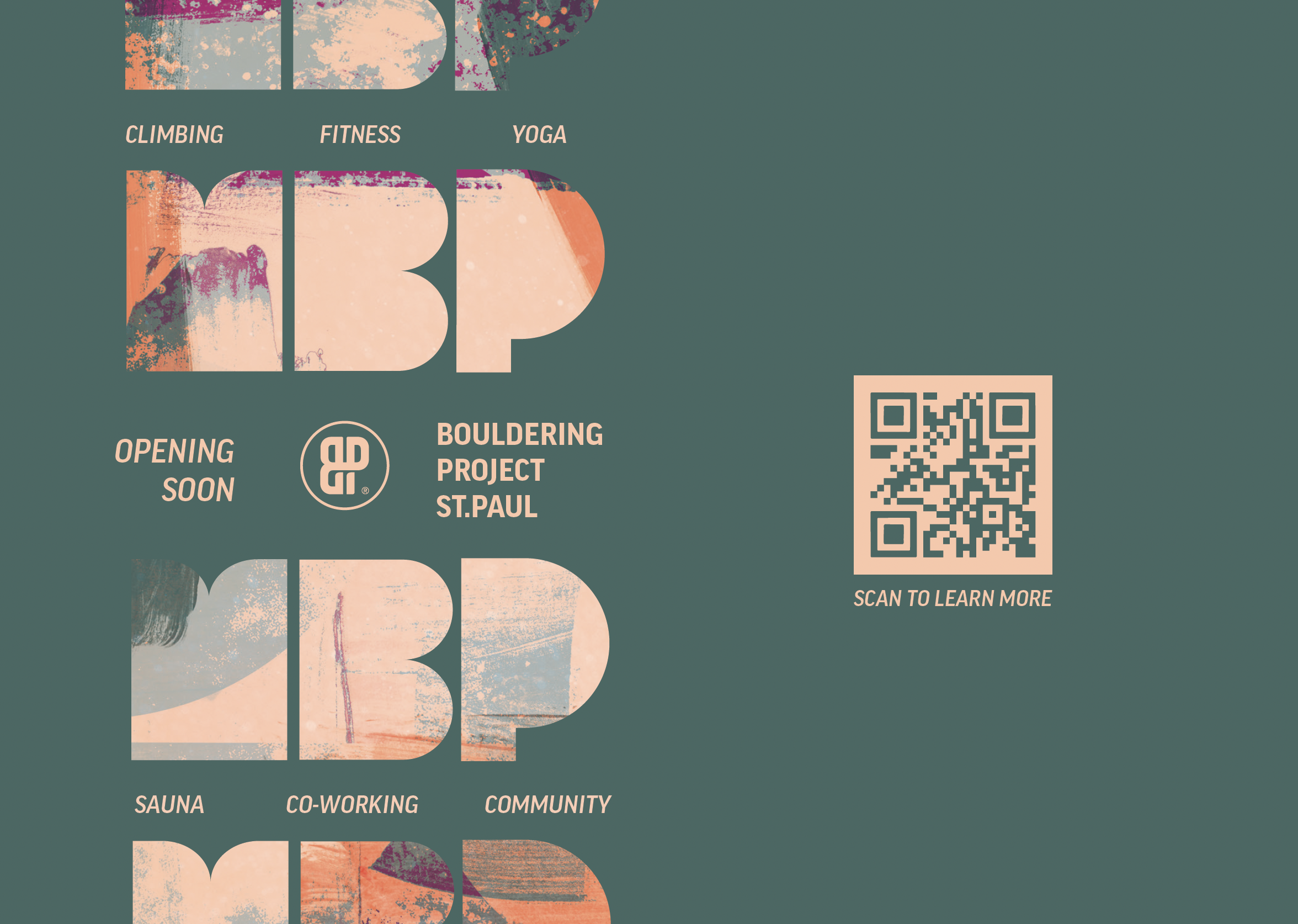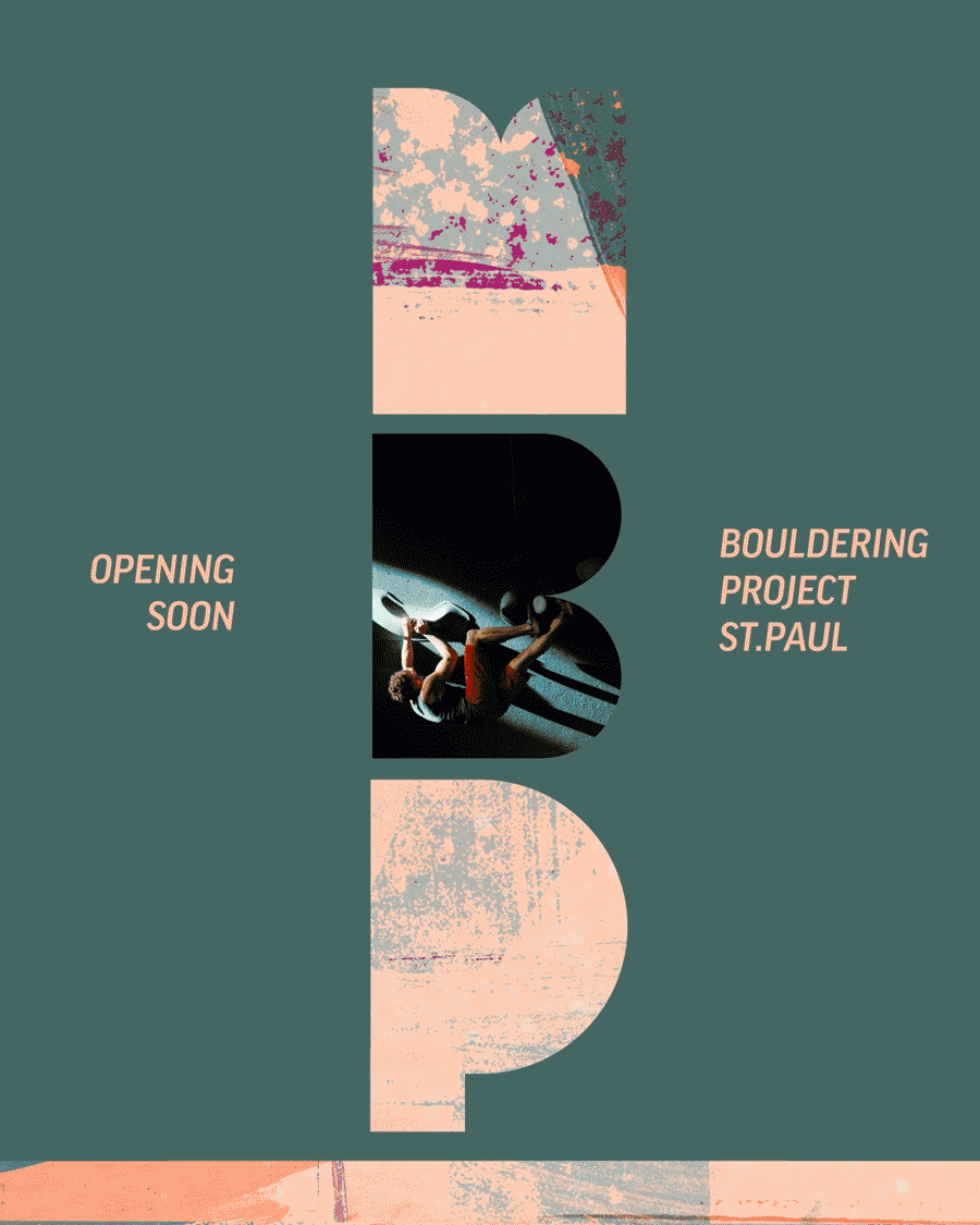 ST.PAIUL MNPLS BOULDERING PROJECT GYM (Gym visual identity/branding & environmental design) it starts with a custom designed mural and then is expanded to apparel, print, digital assets and beyond.